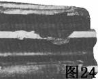 圖24中行星齒輪的大部分齒頂已碎掉。作業(yè)載荷產(chǎn)生的應(yīng)力在這個(gè)點(diǎn)引起裂紋。最后,可能是由于疲勞,這些裂紋繼續(xù)發(fā)展,直到齒的表面。如果這是在短的使用之后發(fā)生的,可能表面硬化深度過(guò)大,需要作金相檢查來(lái)作出判斷。